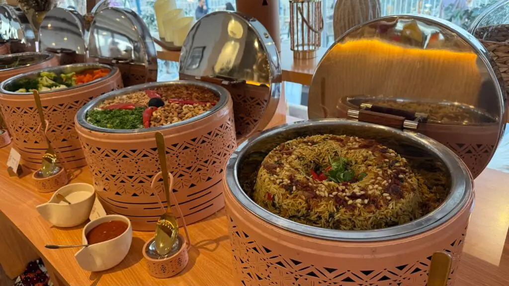 مأدبة عالمية بلمسة محلية في البوفيه، كانت الخيارات كثيرة متنوعة، تشمل أطباقاً تقليدية، بدأت بالأطباق السعودية التقليدية، فجربت الكبسة باللحم الطري، وكانت مليئة بالنكهات العميقة و محضّرة بإتقان تام. بجانبها، كان هناك برياني الدجاج وسمك السلمون المشوي بصلصة الزعفران، مما أضاف لمسة عالمية إلى التجربة، وكل طبق كان يتميز بطعمه المتوازن وطريقة التقديم الأنيقة.