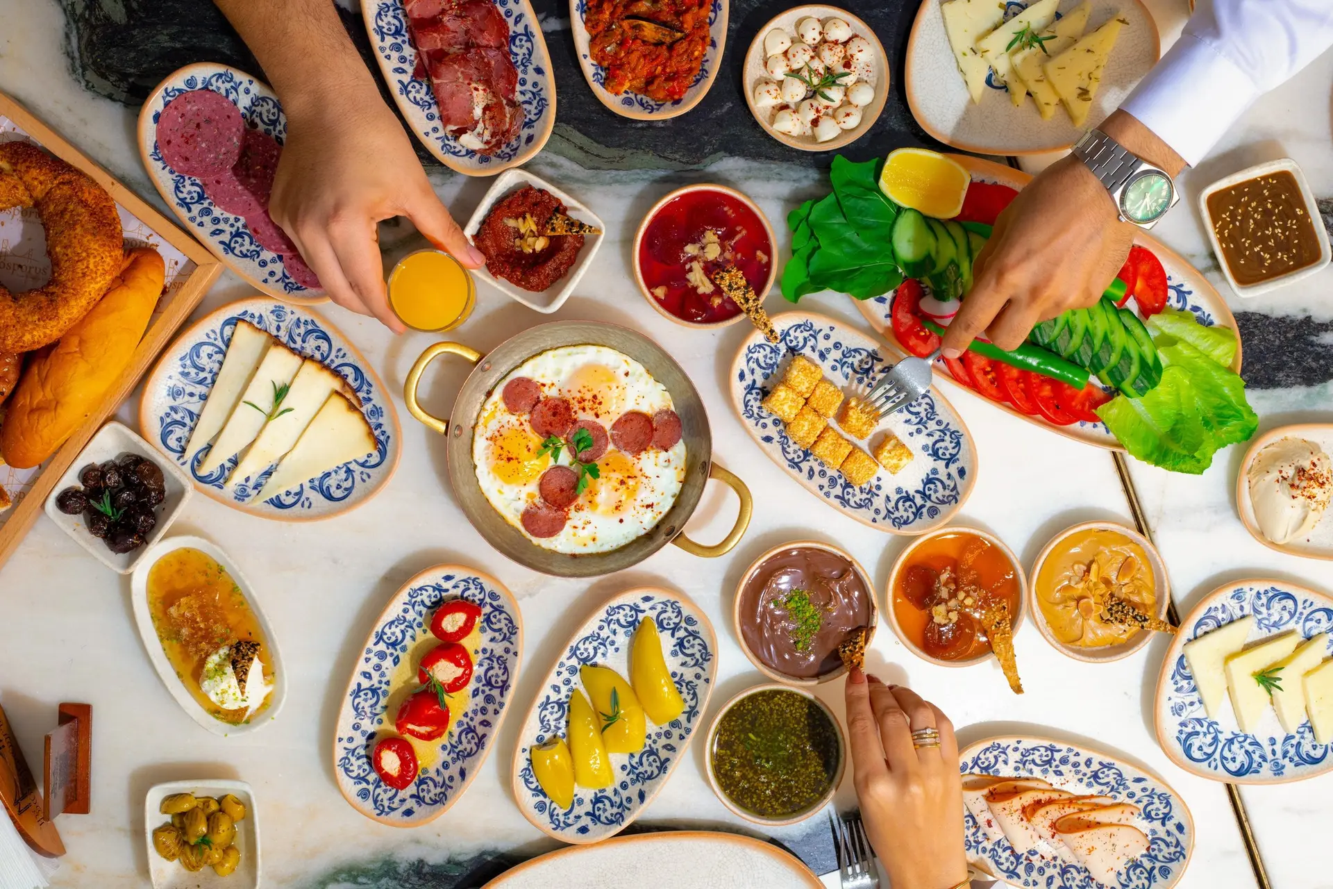 - إفطار إسطنبول: مجموعة غنية من الأطعمة لبداية رائعة محضرة من البوريك، ديك رومي مدخن، بسطرمة، زيتون، جبنة، فواكه مجففة، فلفل محشي، فليفلة محشية، عسل مع القشطة، دبس مع الطحينة، خضار، شاي او عصير برتقال.