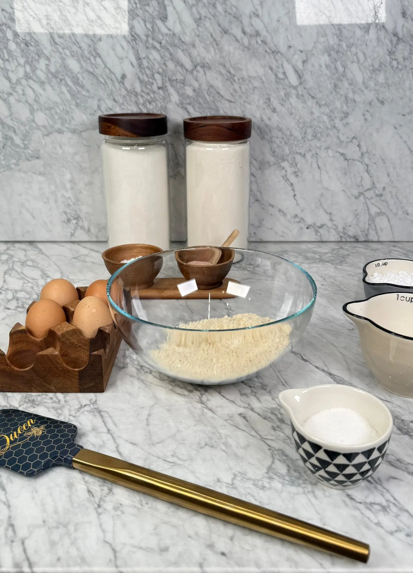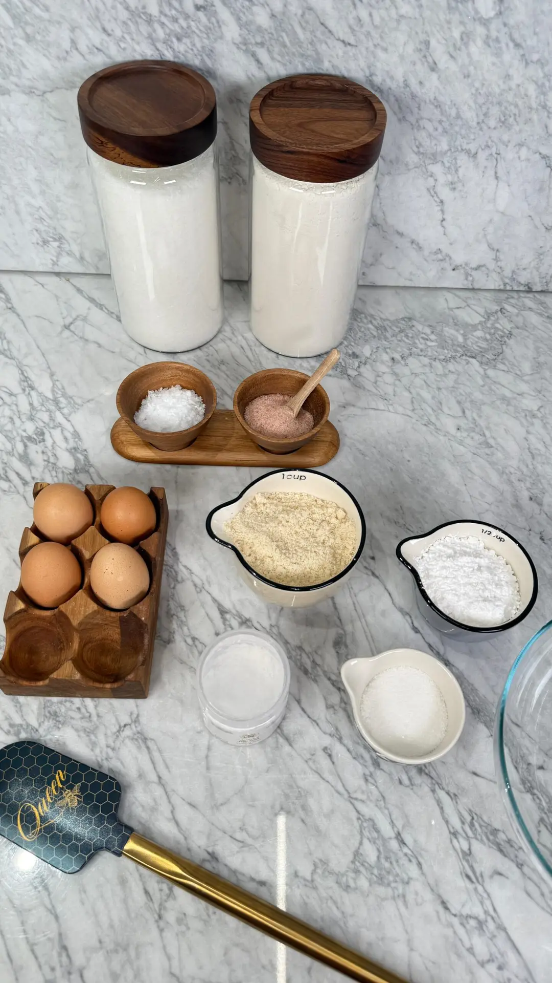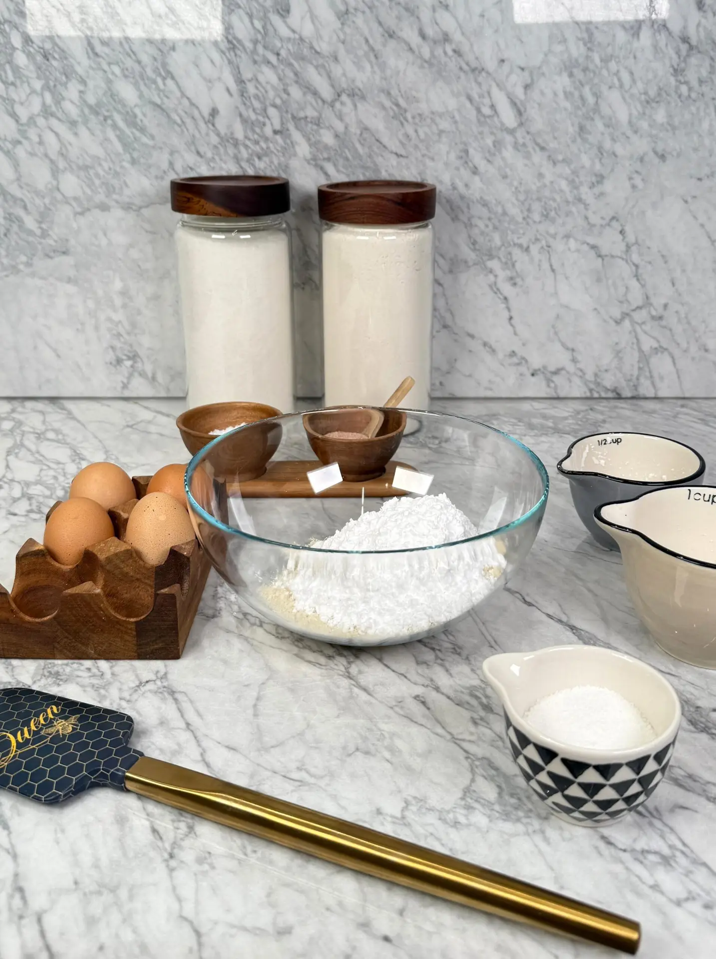 - يُنخل اللوز المطحون مع السكر البودرة في وعاء واسع.
