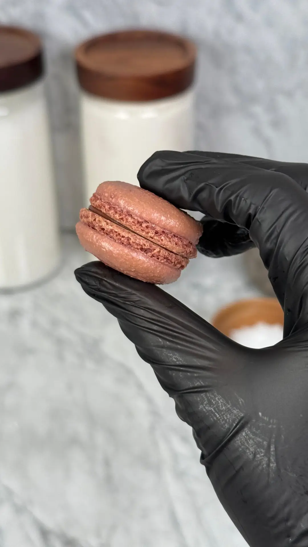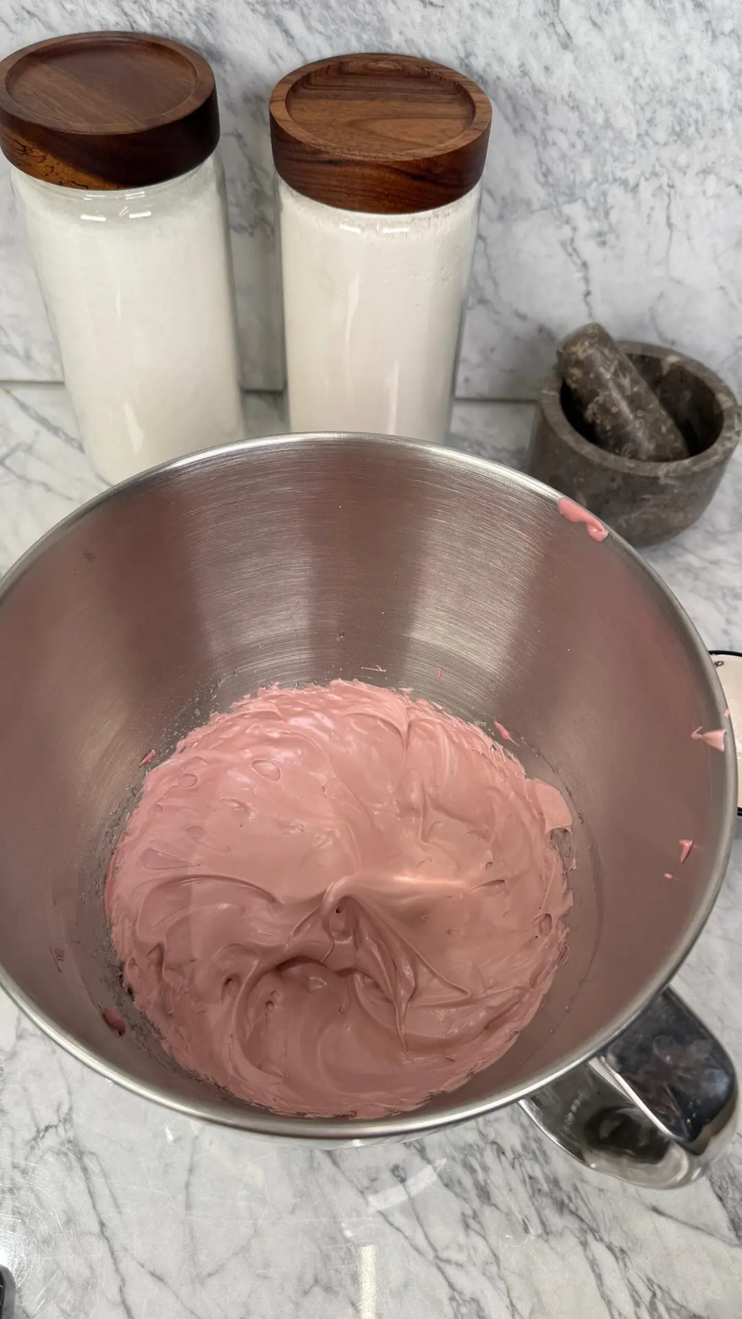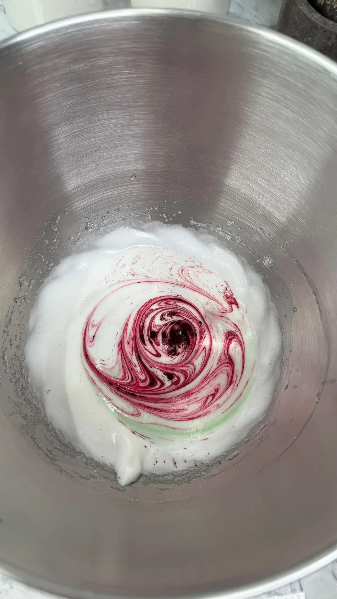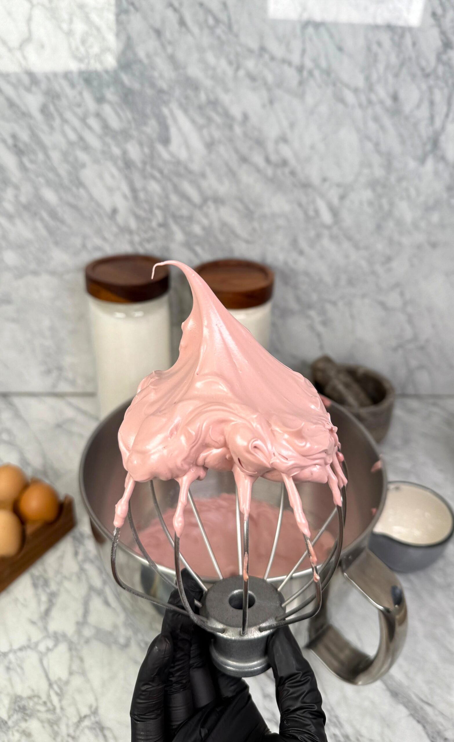 - يُضاف السكر الناعم تدريجياً مع الاستمرار بالخفق حتى يتكوّن مارينغ لامع وثابت القوام، ويمكن في هذه المرحلة إضافة لون الطعام المرغوب.