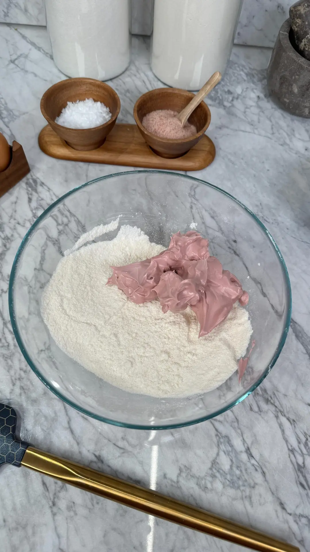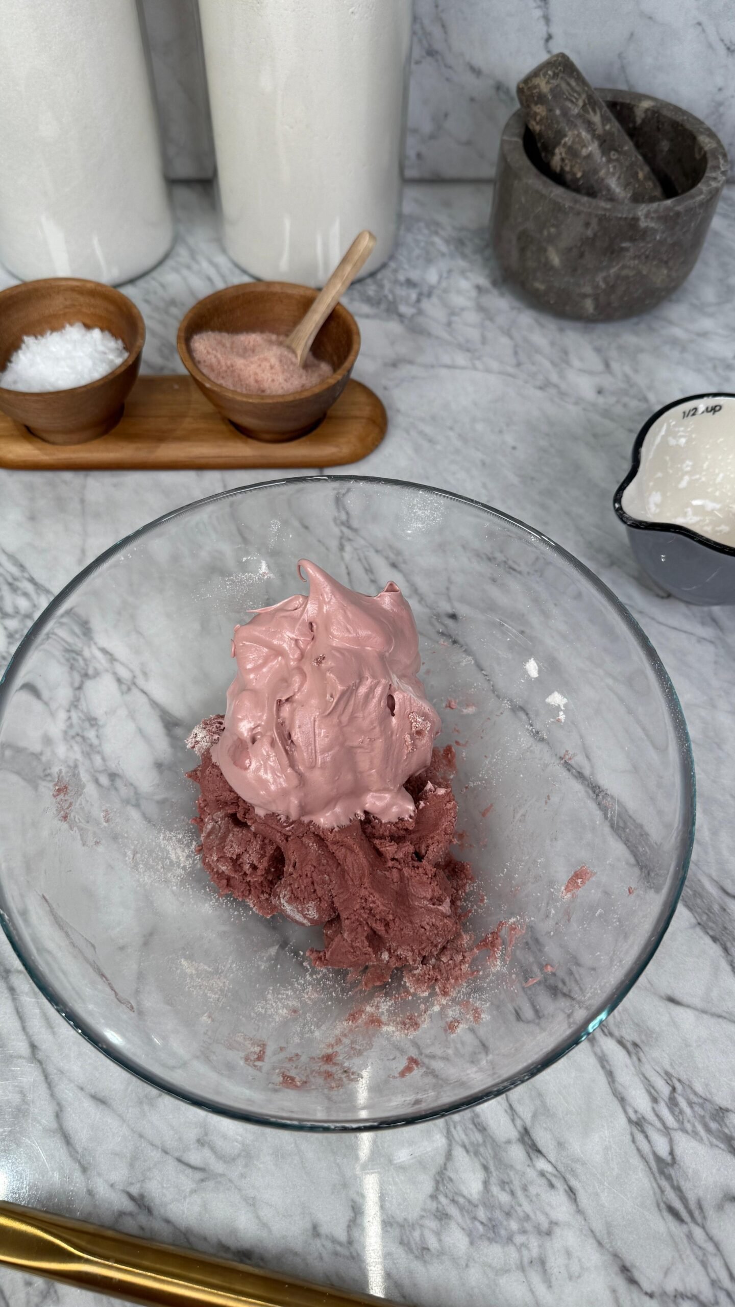 - يُضاف المارينغ إلى خليط اللوز ويُخلط بلطف حتى تتكوّن عجينة متجانسة وسميكة القوام.