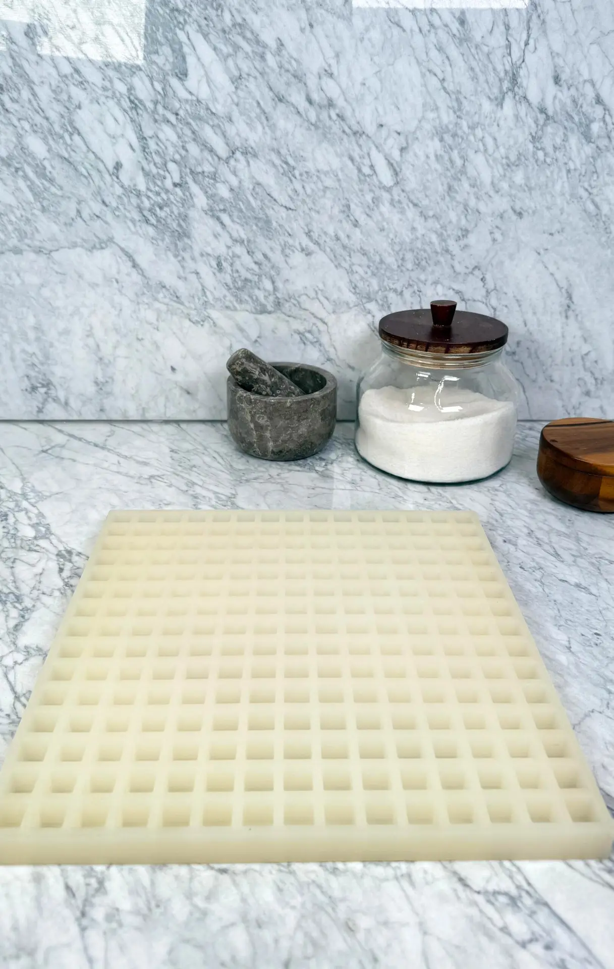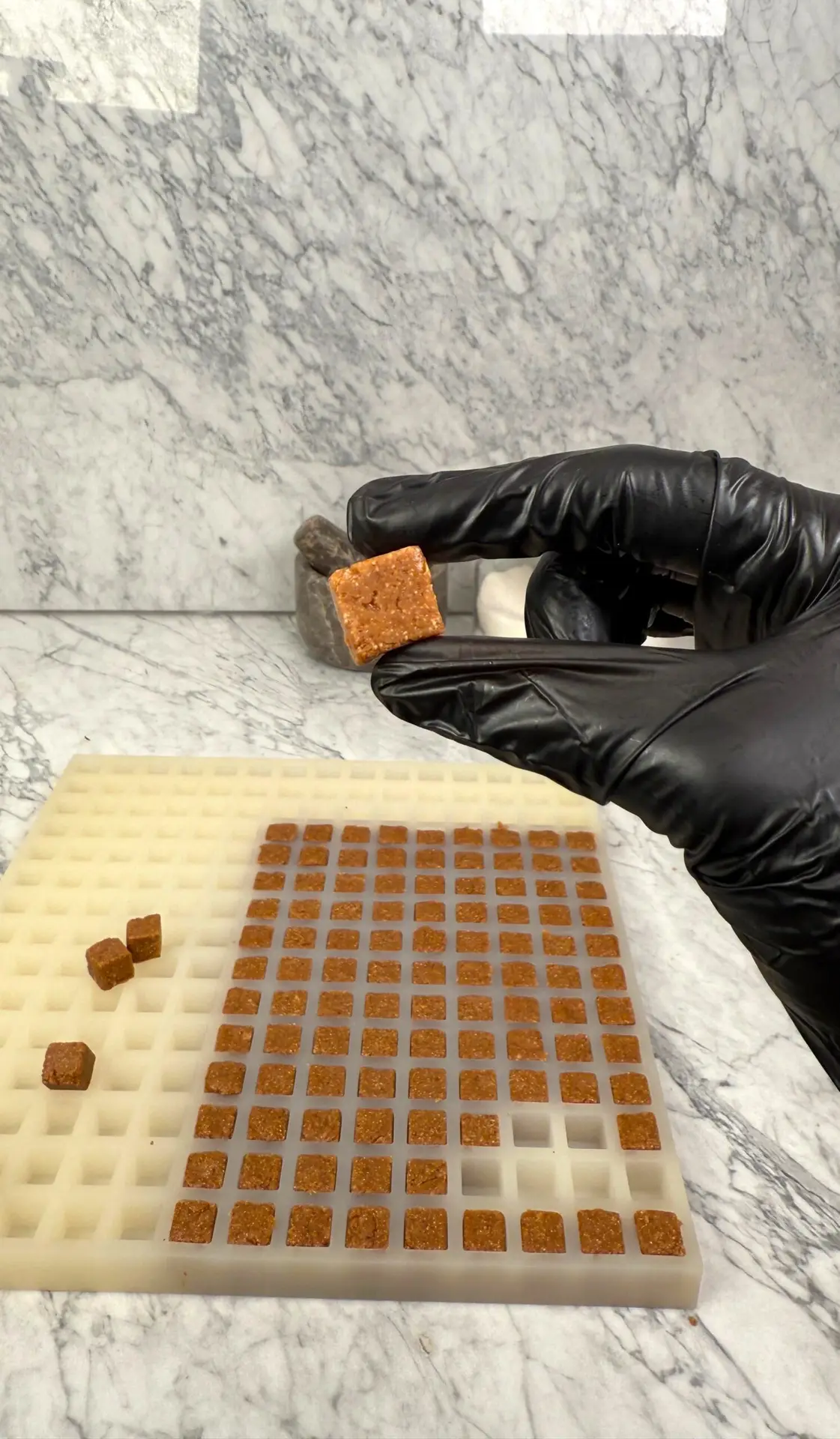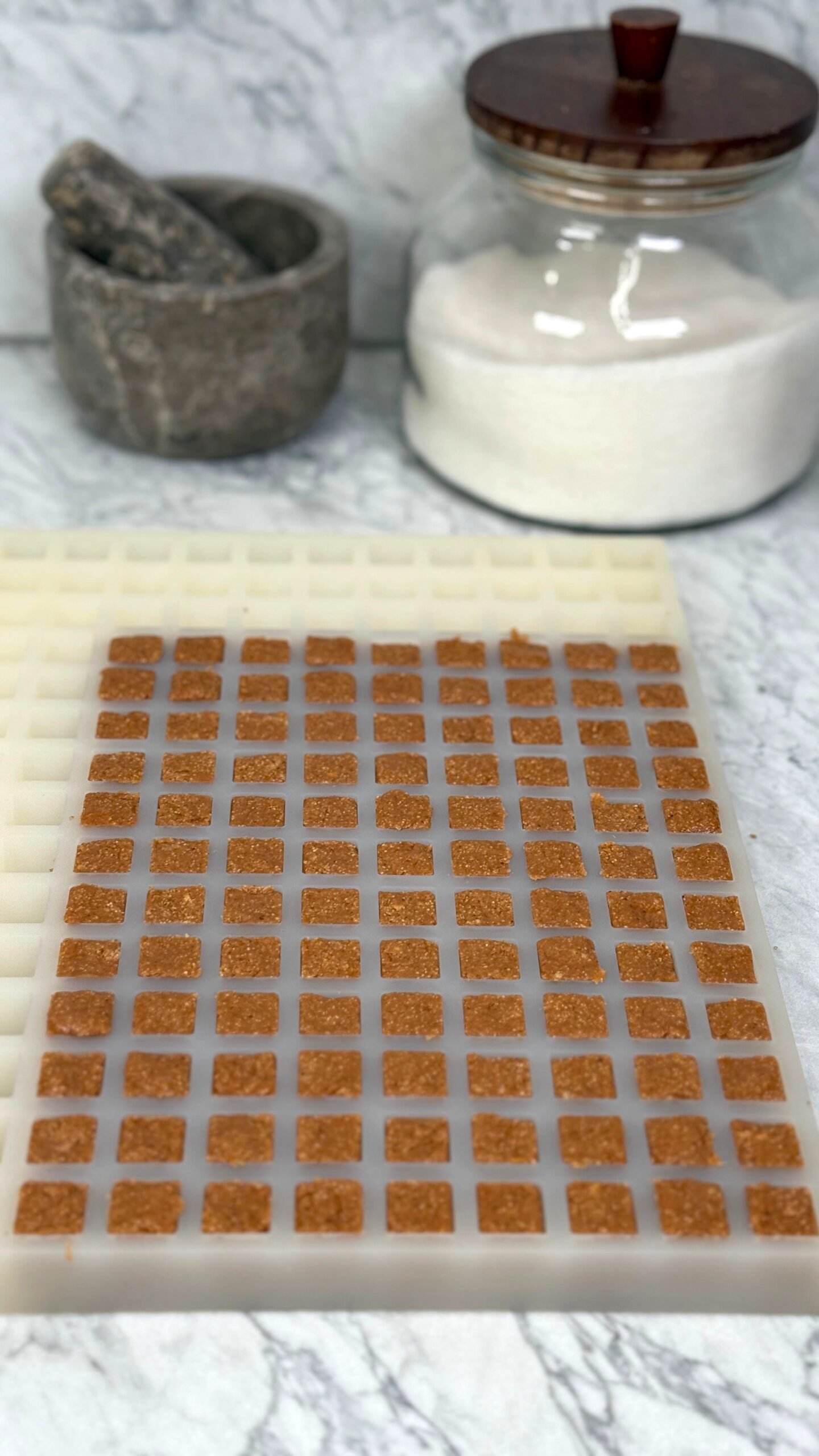 نضع الخليط في أي قالب متوفر، ويفضل قالب مكعبات صغيرة (أنا استخدمت قالب نفس اللي بالصورة).