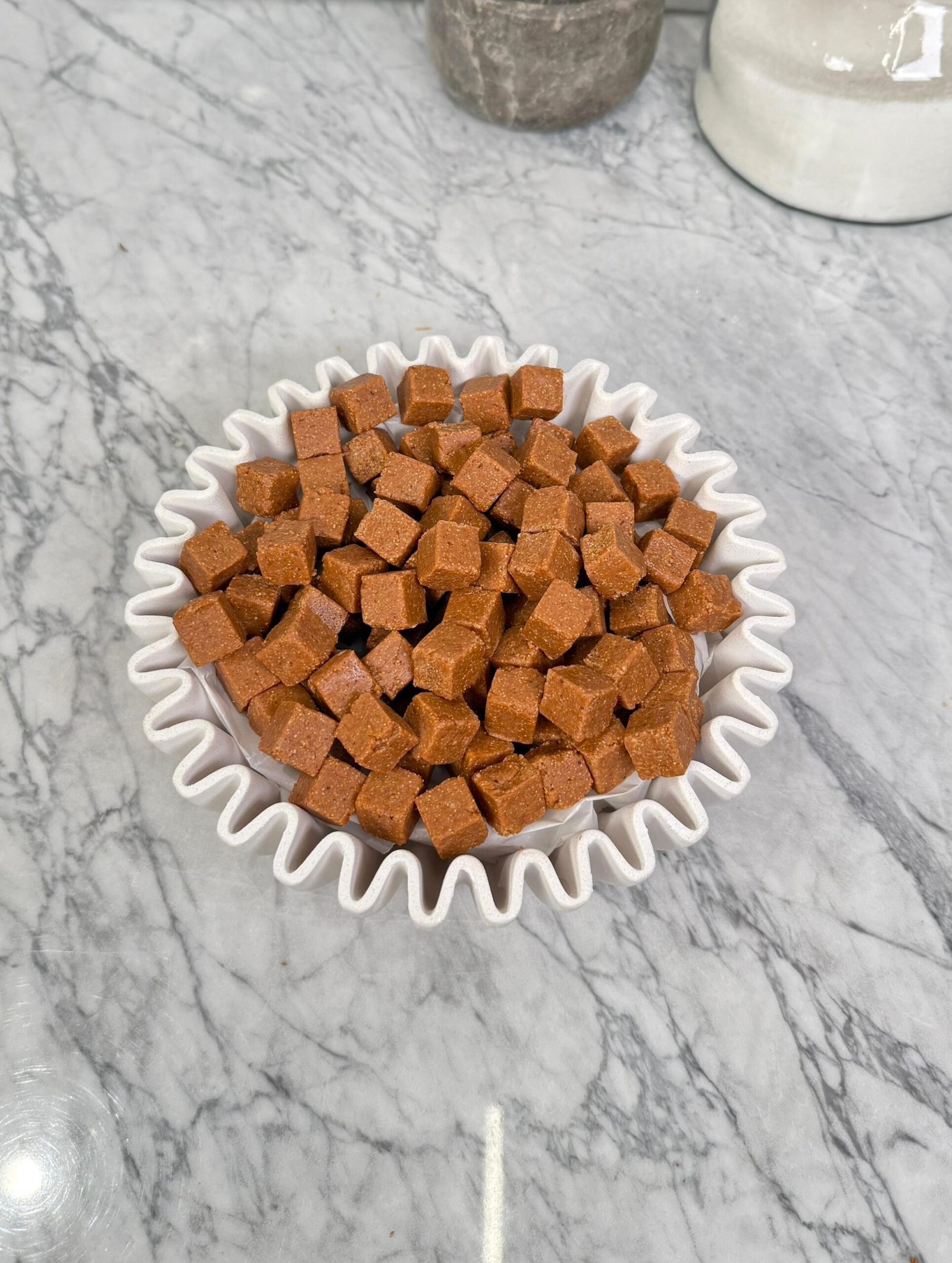 حيث شُكّل الحلى في قوالب صغيرة ليأخذ شكل مكعبات أنيقة. القوام الناعم يجعل هذا الحلى خيارًا مثاليًا للتقديم في المناسبات أو مع القهوة، ويضفي لمسة فاخرة على طاولة الضيافة.