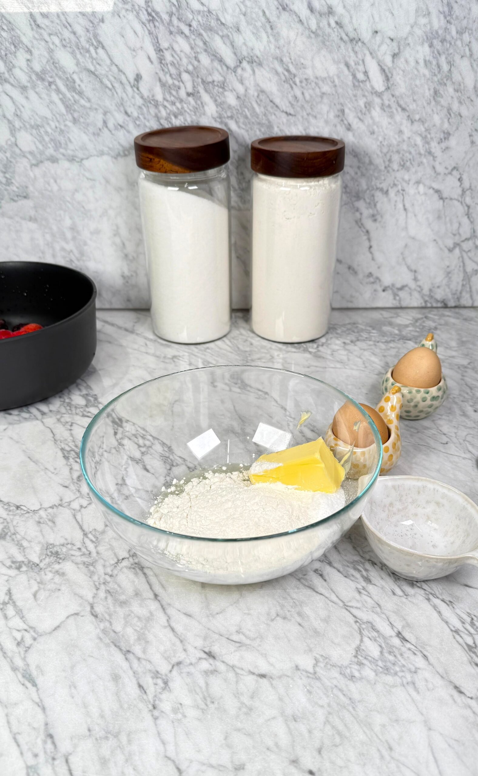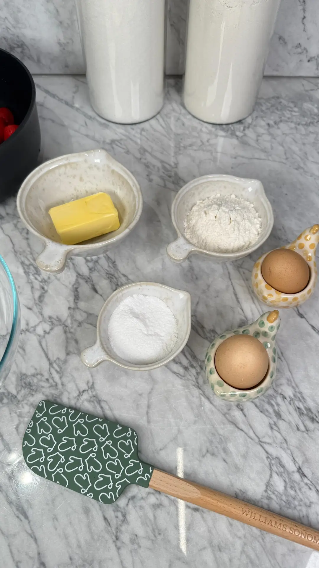 يُخفق بياض البيض مع الزبدة والطحين وسكر البودرة حتى يتجانس الخليط.