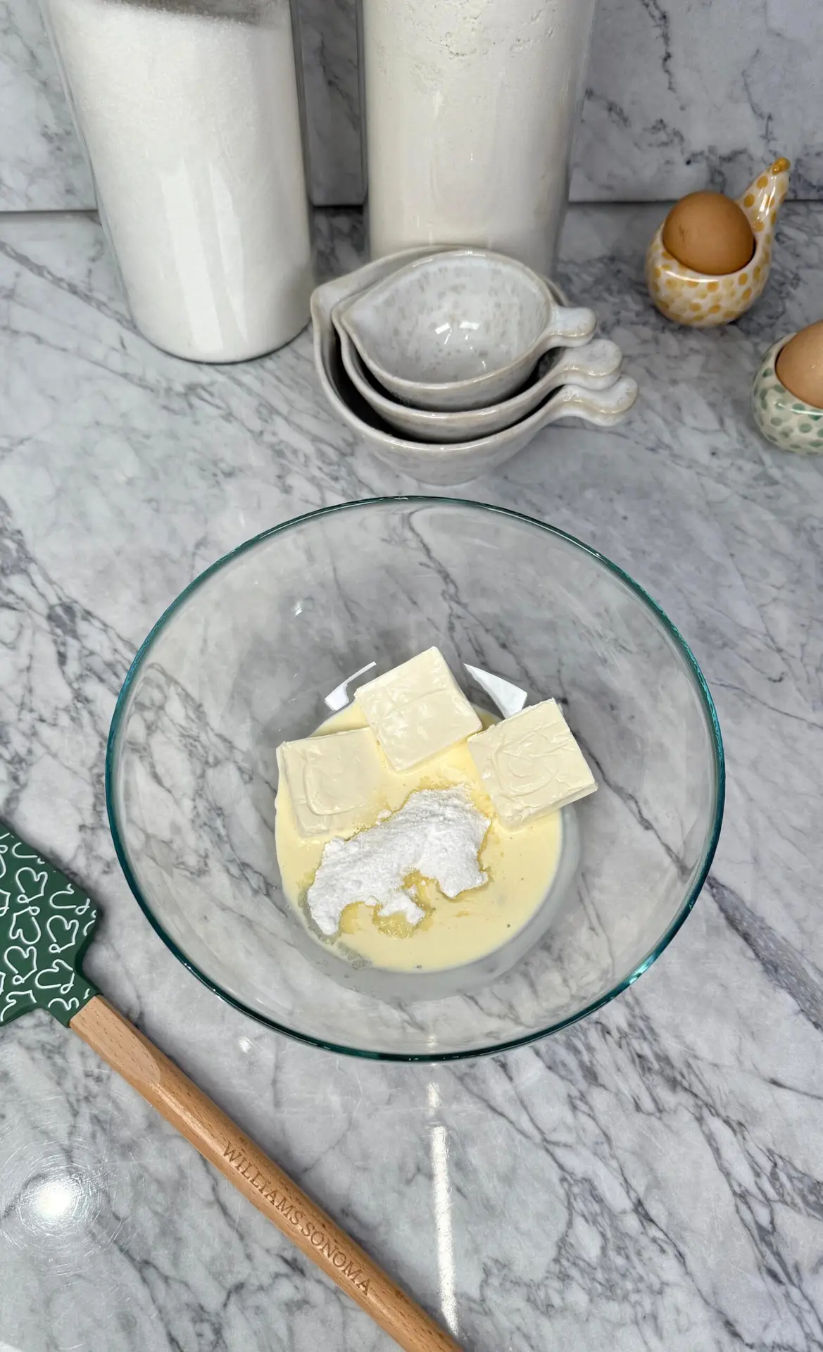 يُخفق الجبن الكريمي مع السكر البودرة حتى يصبح ناعمًا.