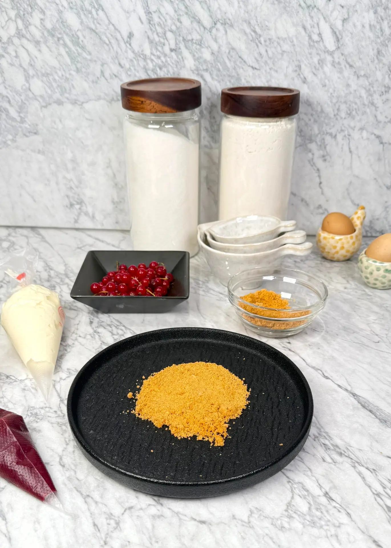 نضع طبقة من البسكويت المطحون بالزبدة في قاعدة الطبق.