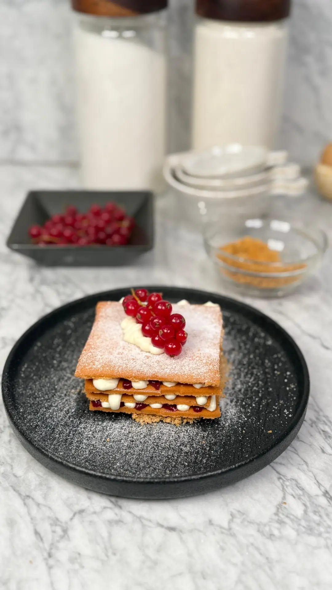 في النهاية، نرش السكر البودرة ونزين بـ حبات التوت.