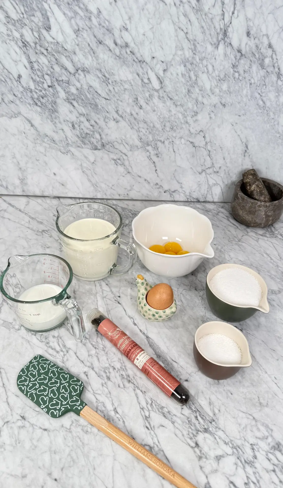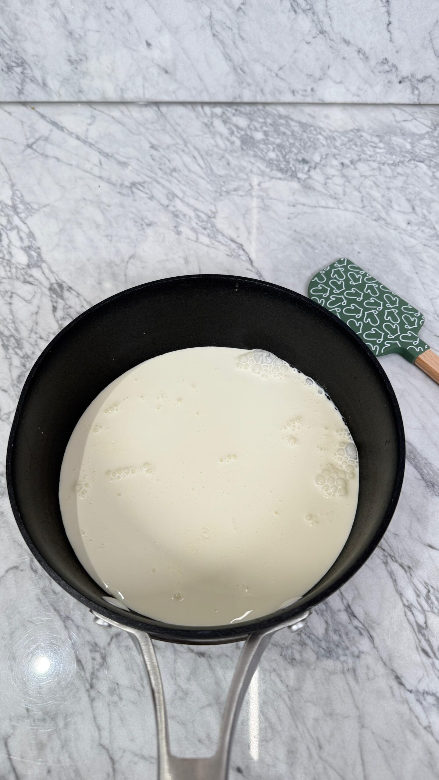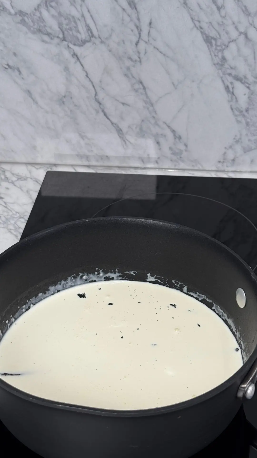 في قدر آخر، يُسخن الحليب مع الكريمة وعود الفانيلا حتى يصل إلى الغليان الخفيف، ثم يُرفع من النار ويُترك ليبرد قليلًا.