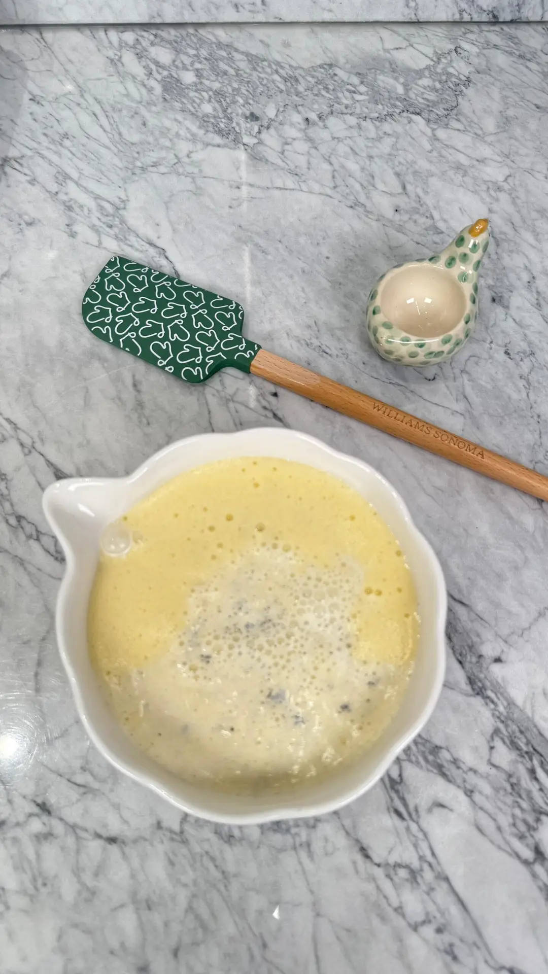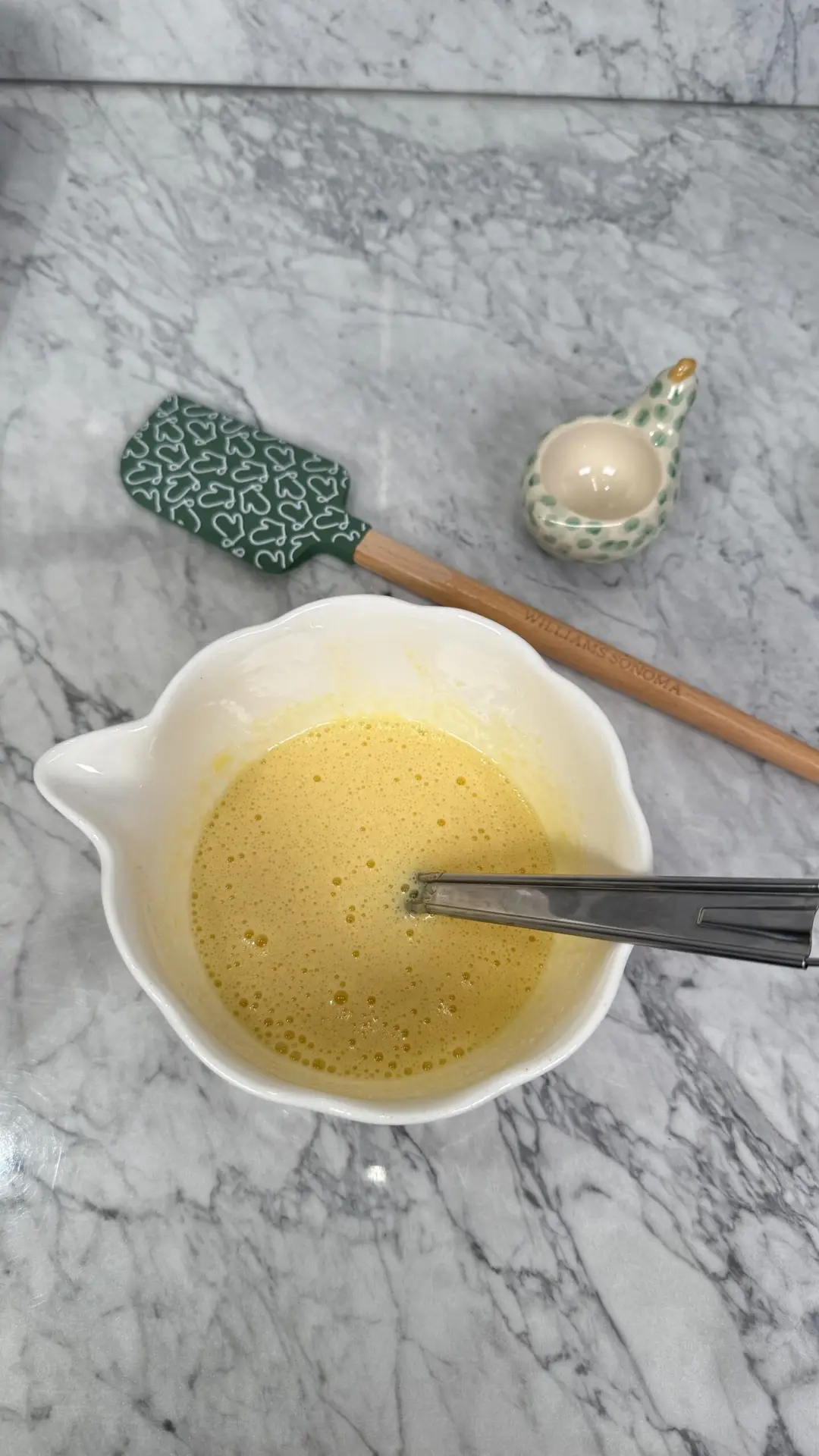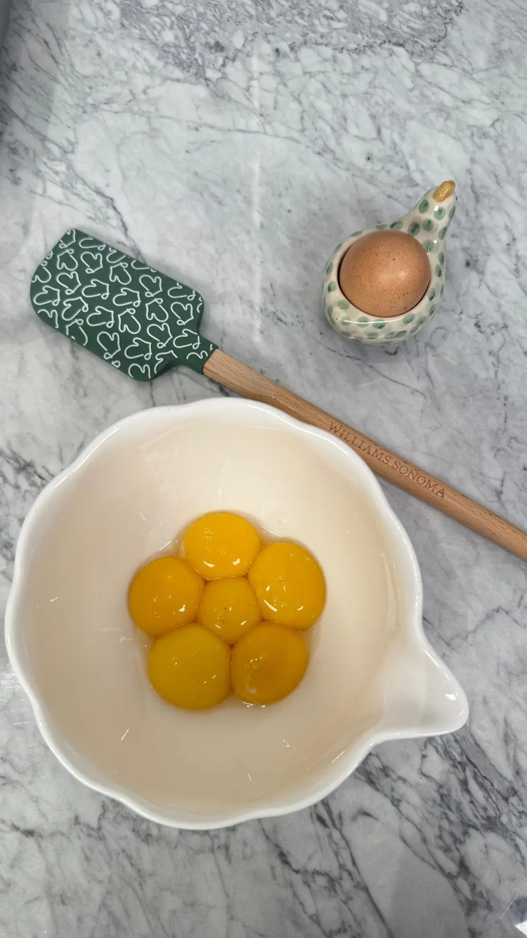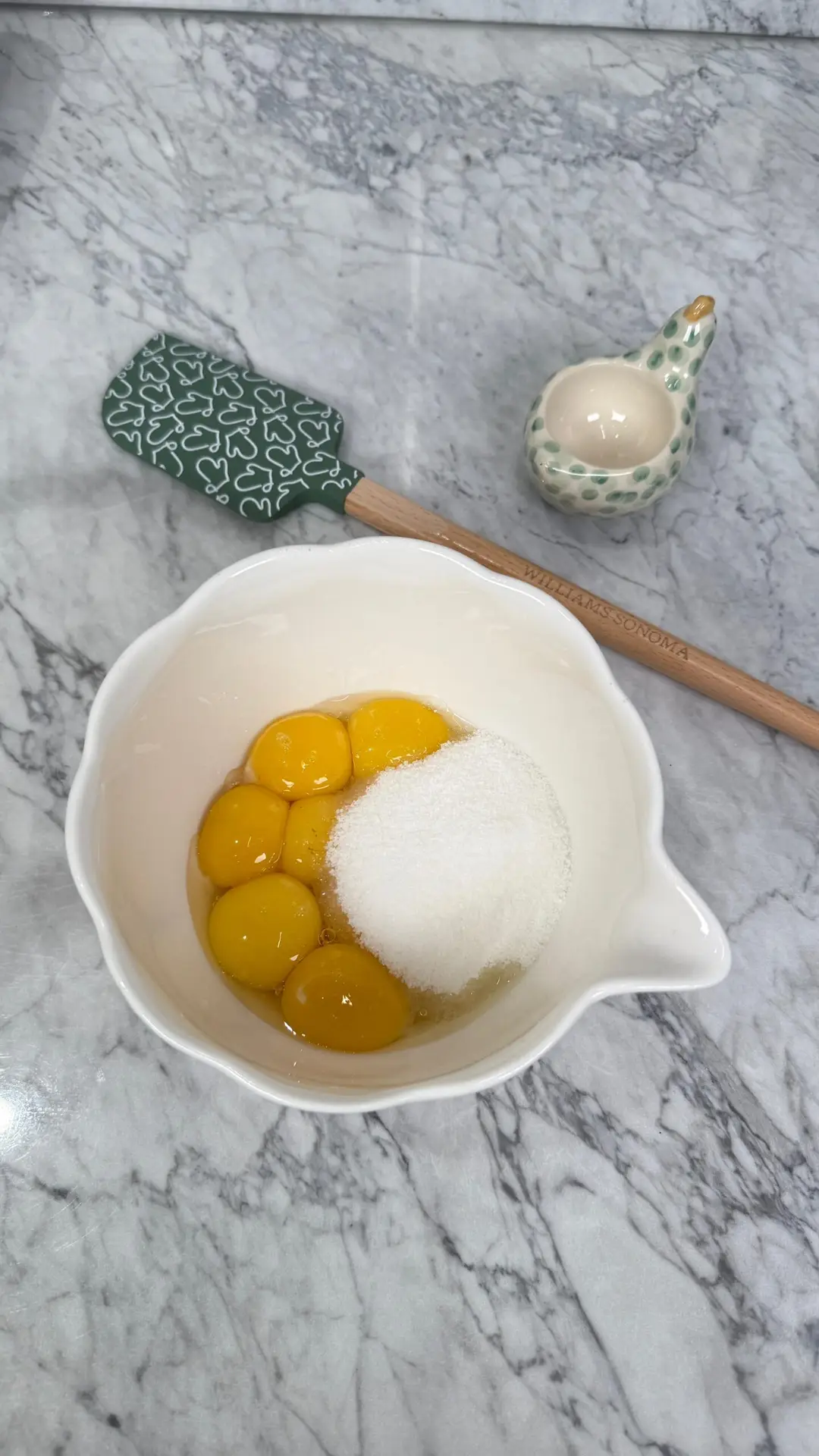 في وعاء، يُخفق صفار البيض مع البيضة الكاملة والسكر حتى يذوب السكر.