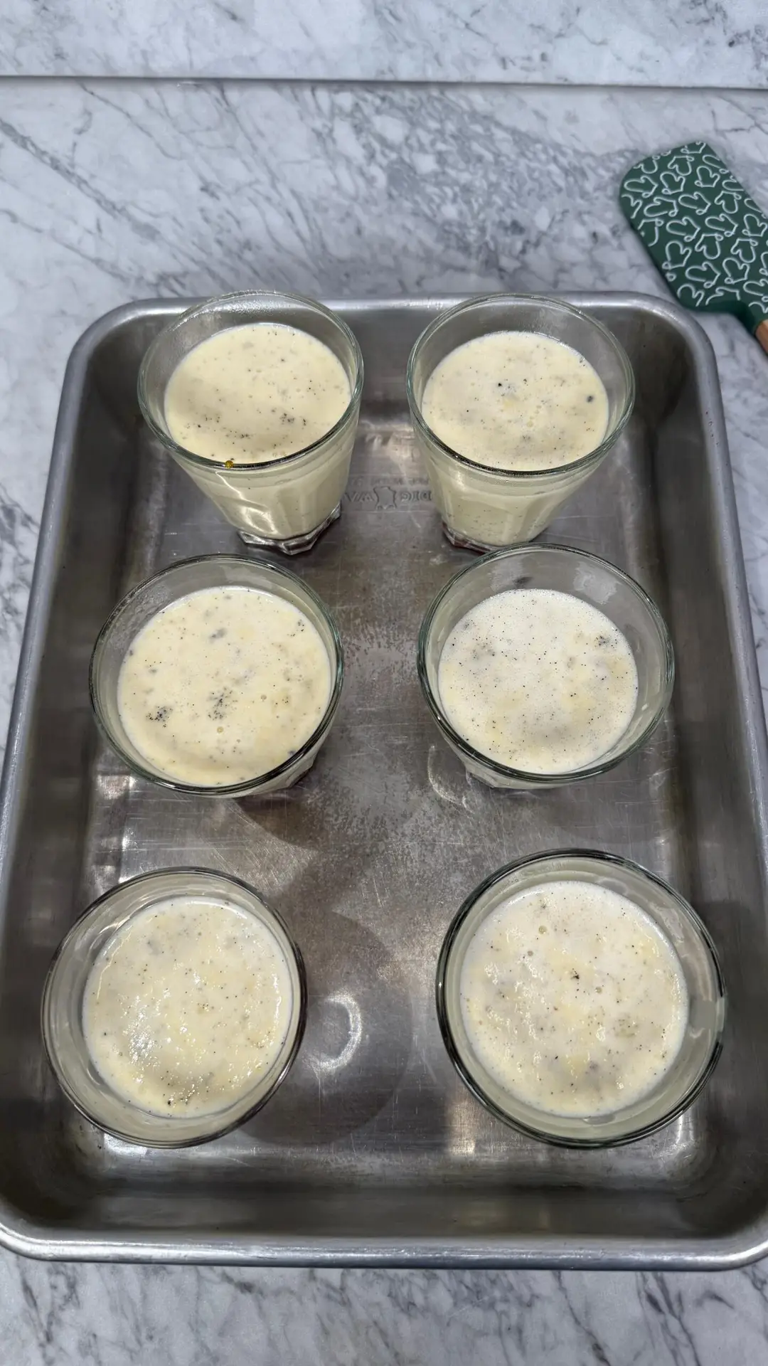 تُرتب القوالب داخل صينية عميقة، ويُضاف ماء ساخن في الصينية حتى يصل إلى نصف ارتفاع القوالب.