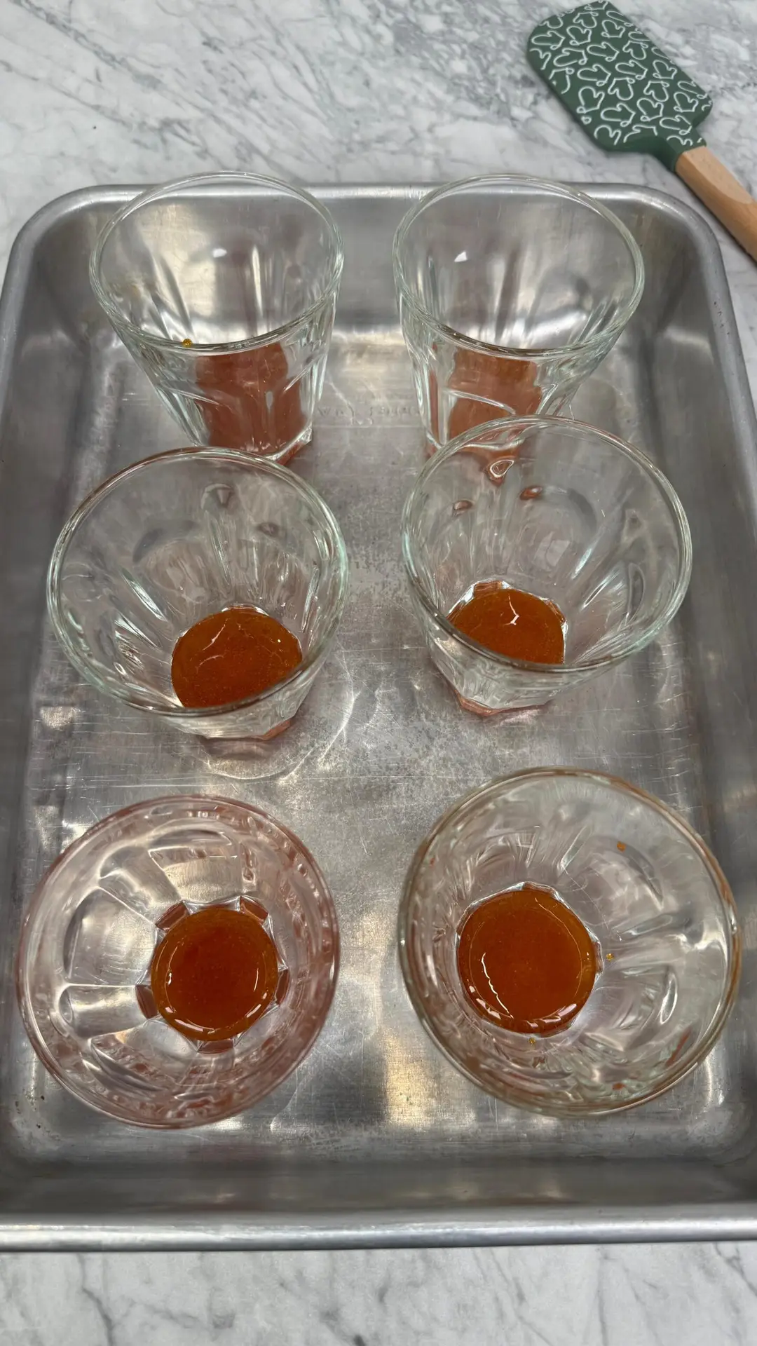 يُوزع فورًا مقدار ملعقة كبيرة في كل قالب مخصص للكريم كراميل.