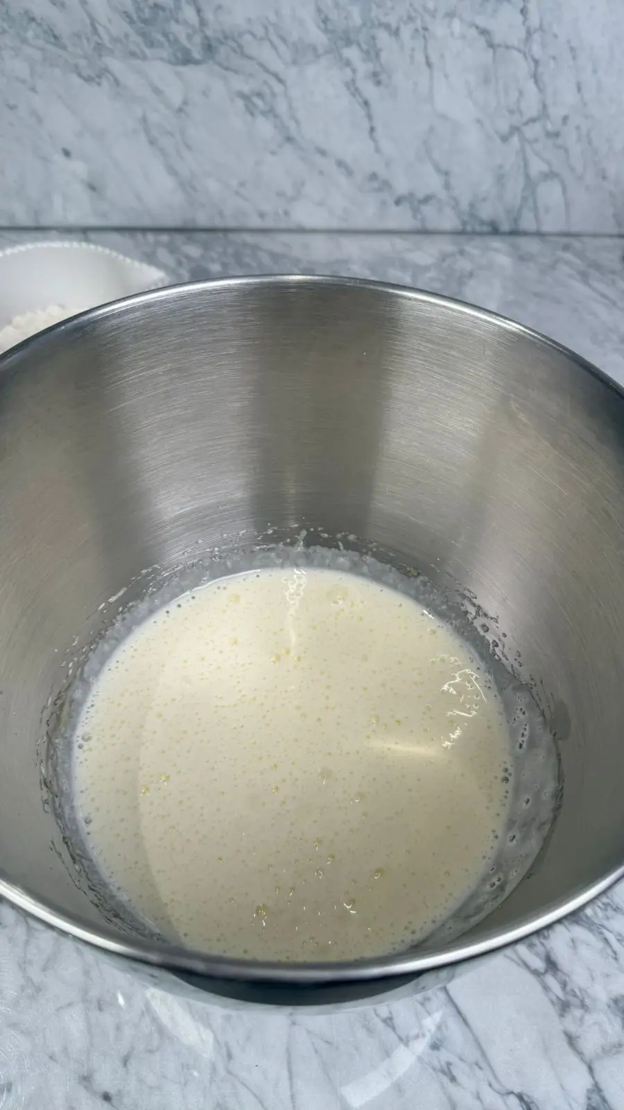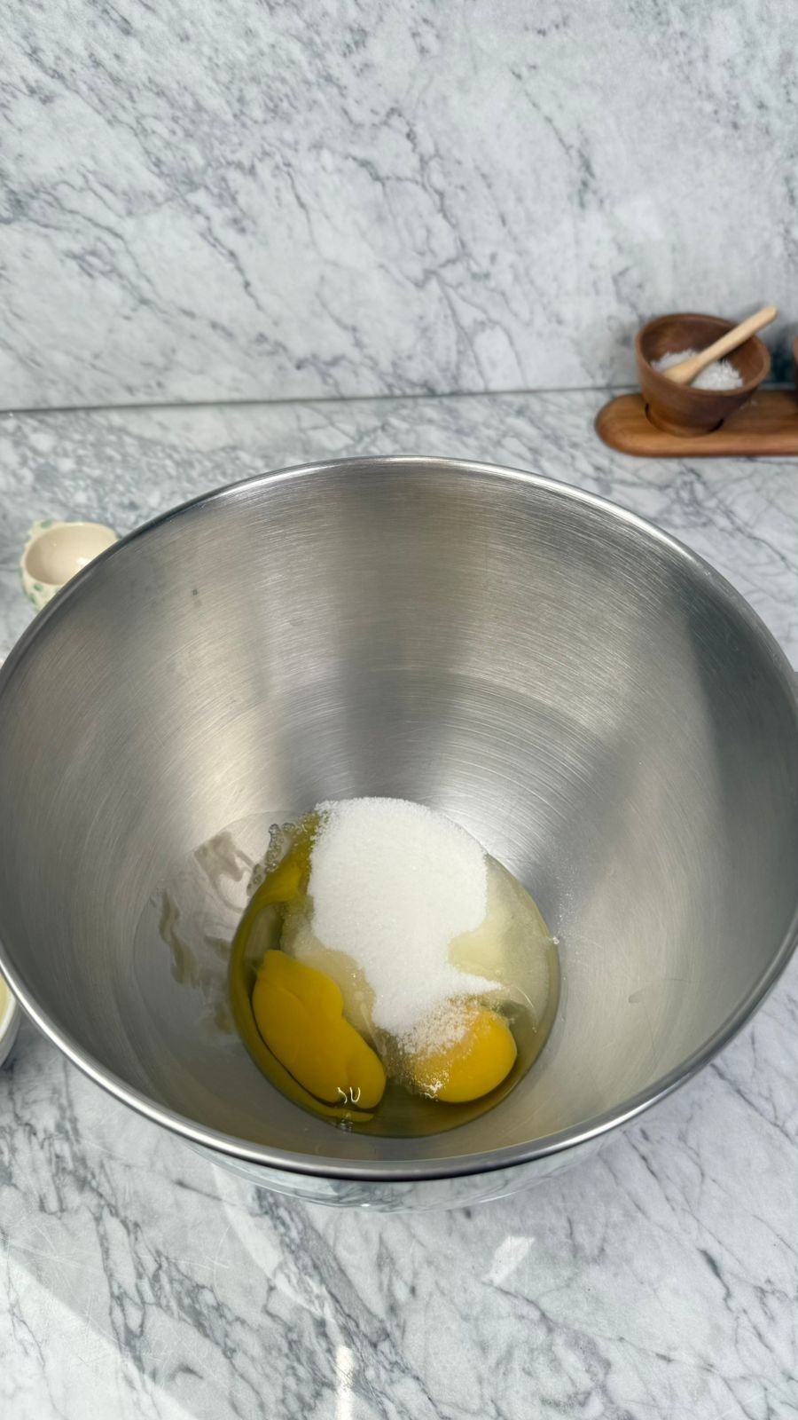 • نخفق البيض مع السكر لمدة 5 دقائق حتى يصبح الخليط فاتح اللون.