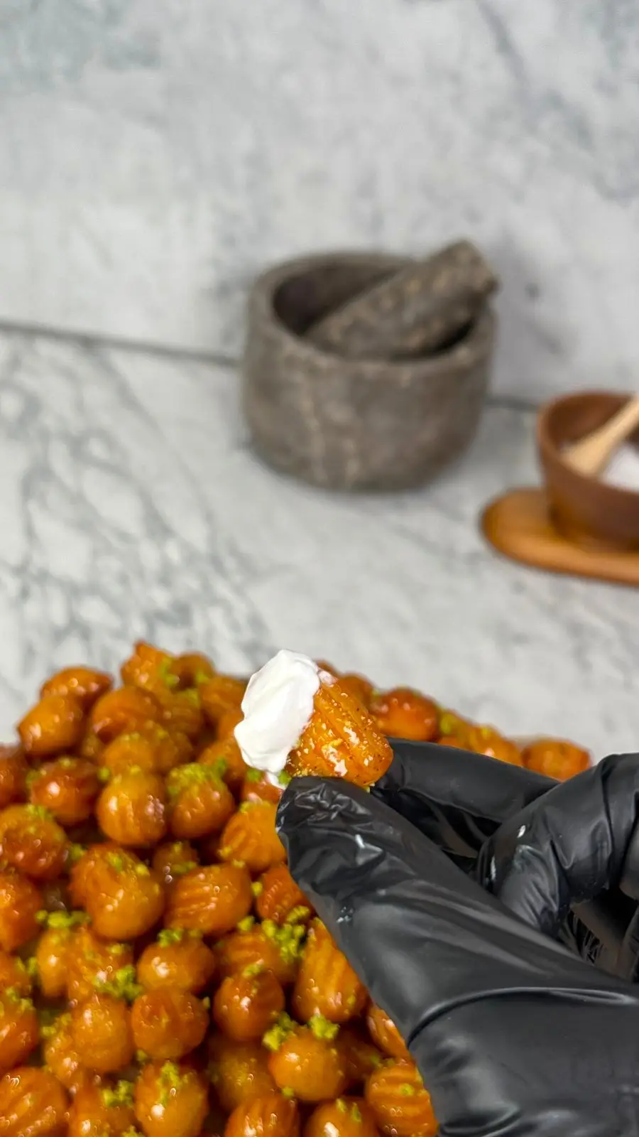 وهي ساخنة، نسكب عليها الشيرة الثقيلة للحفاظ على القرمشة.