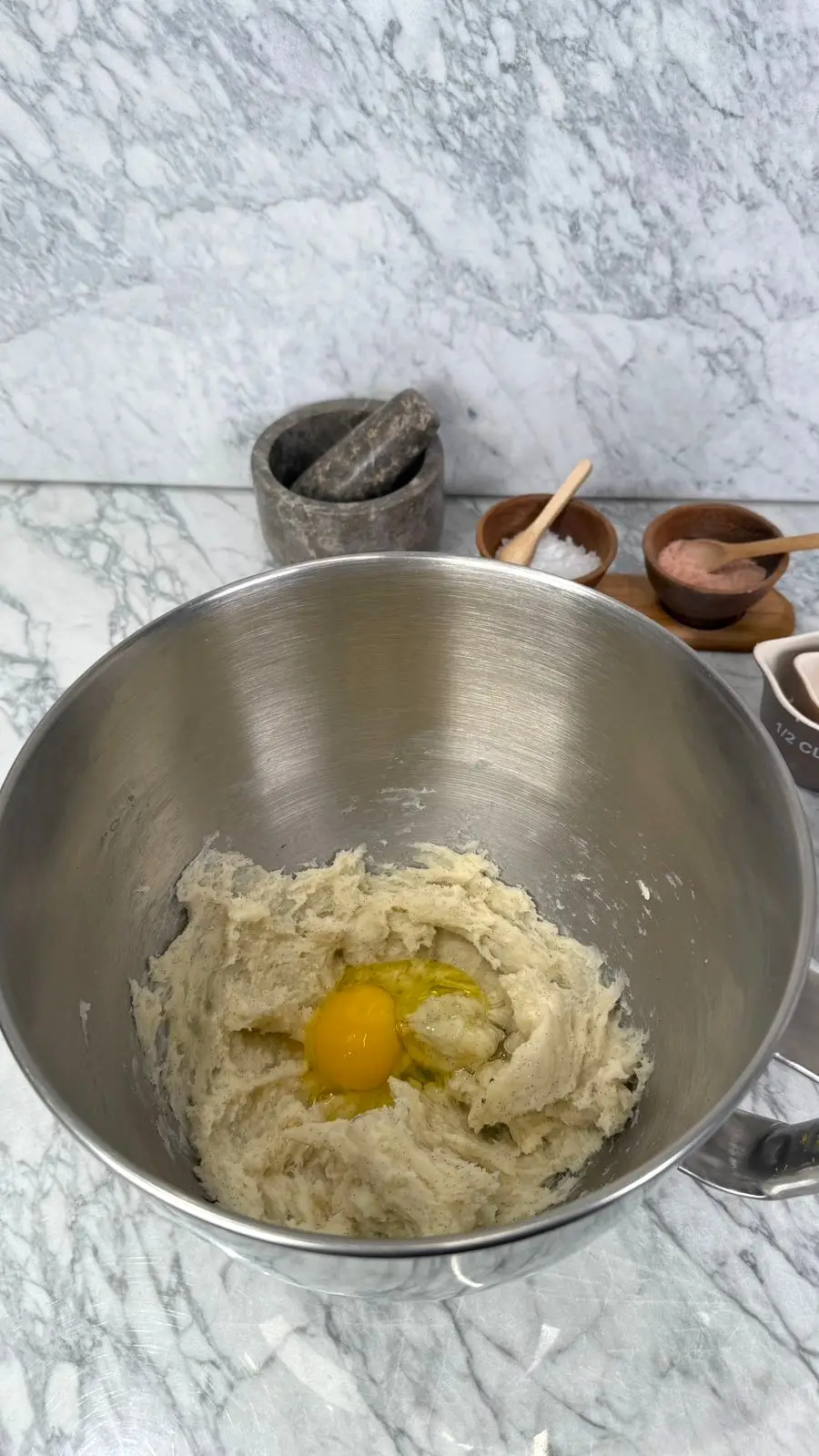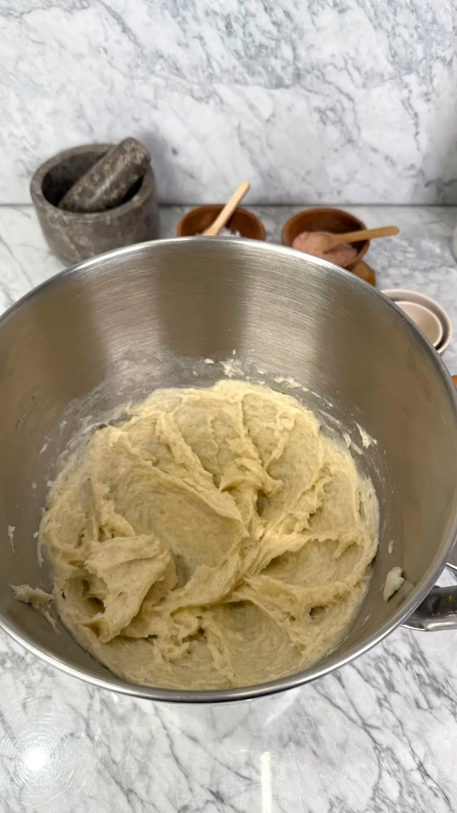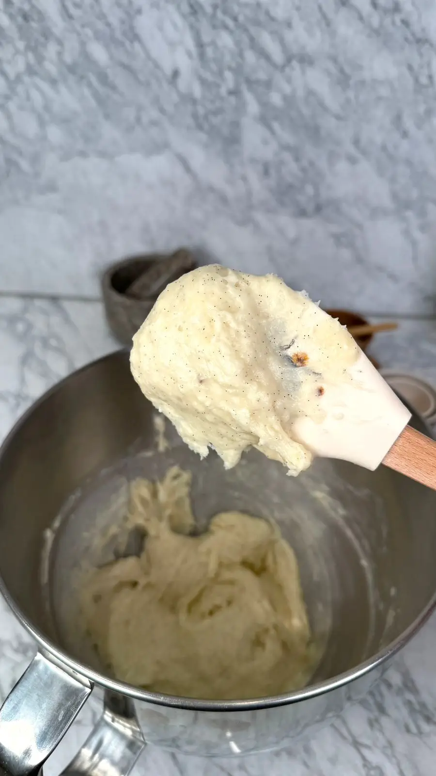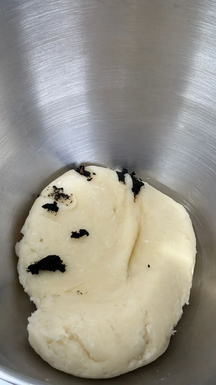 نضع العجينة في العجانة، ثم نضيف البيضة والفانيلا ونخلط جيدا حتى يصبح القوام متماسك وناعم.