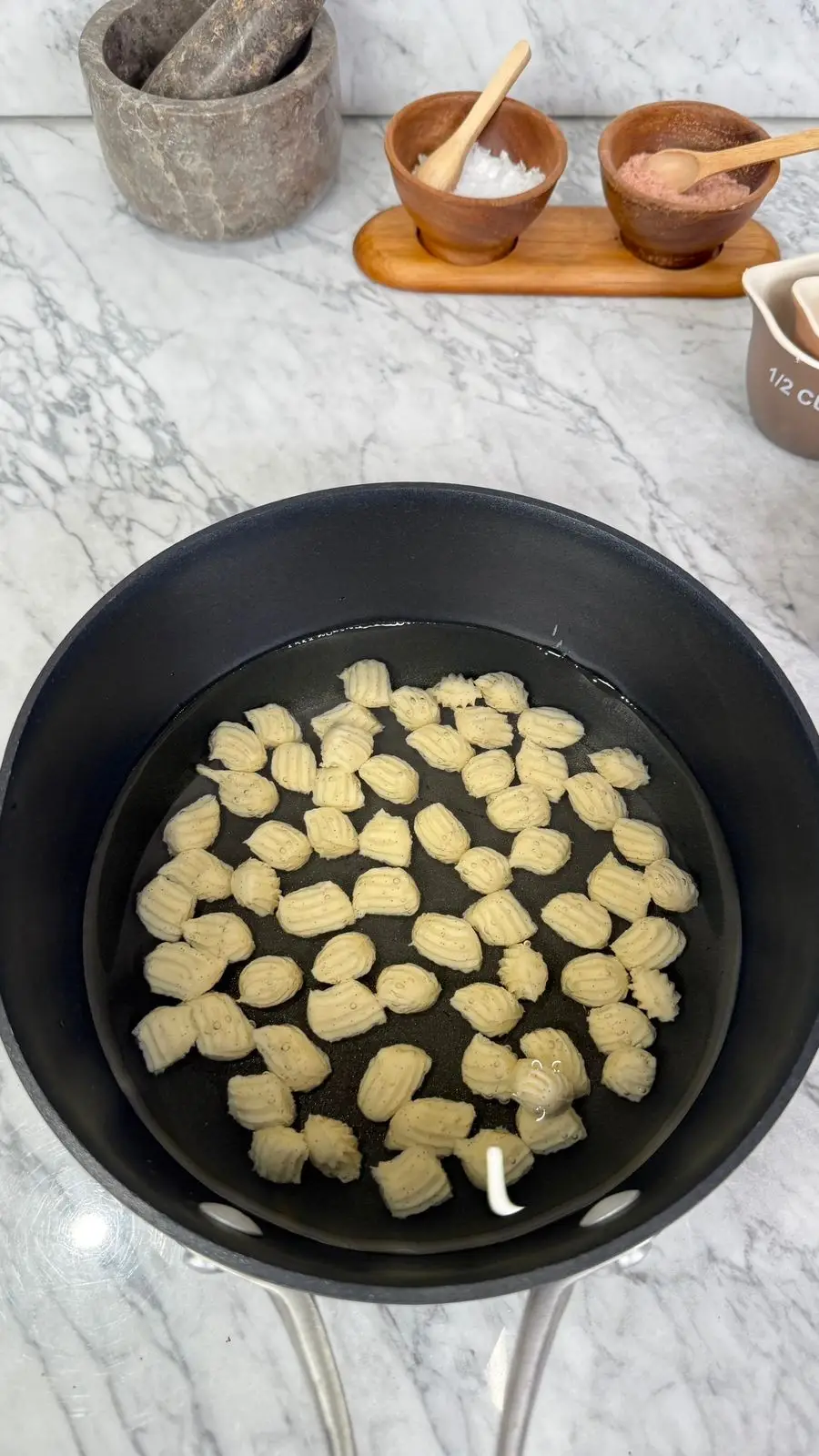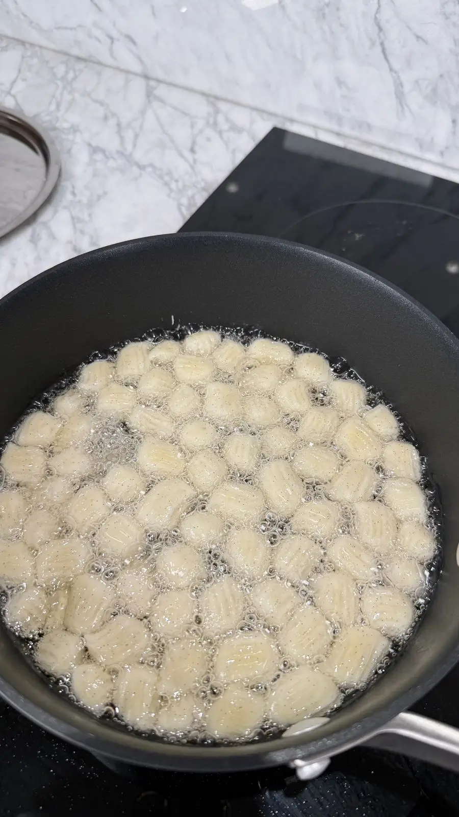 نشكل العجينة في زيت بارد، ثم نشغل النار ونترك الزيت ليسخن تدريجيا.