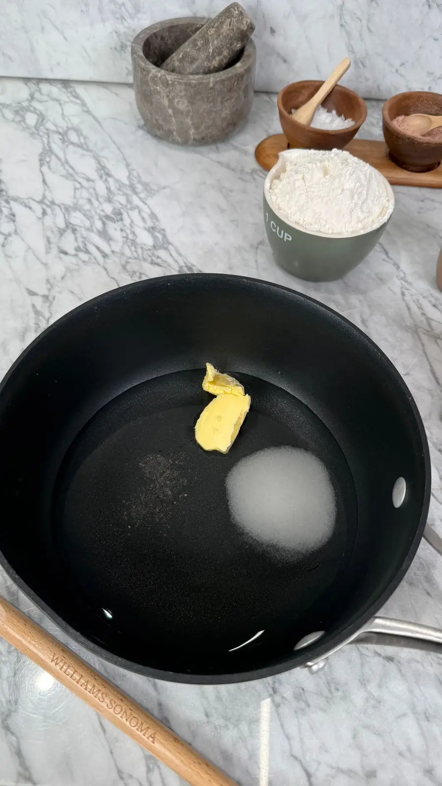 في قدر على النار، نضع الماء والسكر والزبدة ونحرك حتى تذوب المكونات ويبدأ الخليط بالغليان.