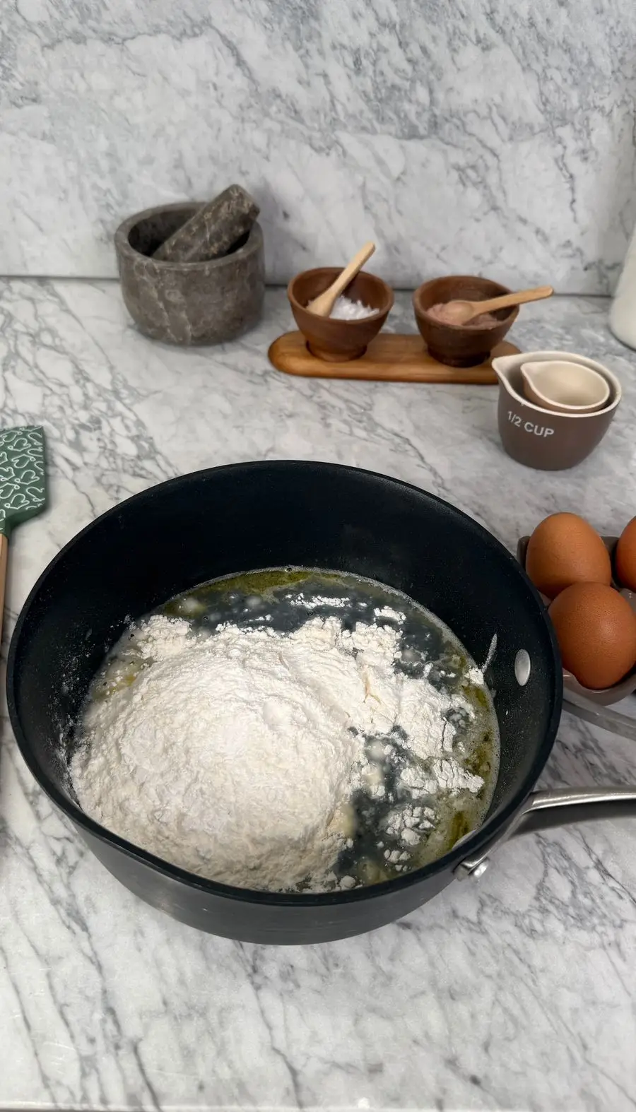 نضيف الطحين والنشاء دفعة واحدة مع التحريك المستمر حتى تتكون عجينة ناعمة ومتماسكة.